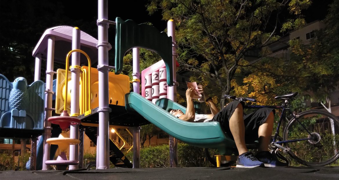 由我二樓租屋處俯視,即能望見的這座公園:範圍不大,規模簡單,樹種參差環繞,其餘的就都只是草皮。公園四周以常見的紅地磚包圍,中心則擺設了一座沒甚麼質感的綜合型塑膠滑梯。整體而言,算得上是,十分僵硬的設計。雖然不特別美麗,但總算明亮,而且實際──晚餐飯後的大人們沿著泥磚散步;下課放學後的小孩子則鑽爬滑梯遊戲;年輕的戀人搭襯黃昏牽手在街燈暗處慢聊情話;閒居的老人則選定清晨樹蔭放送廣播早操……