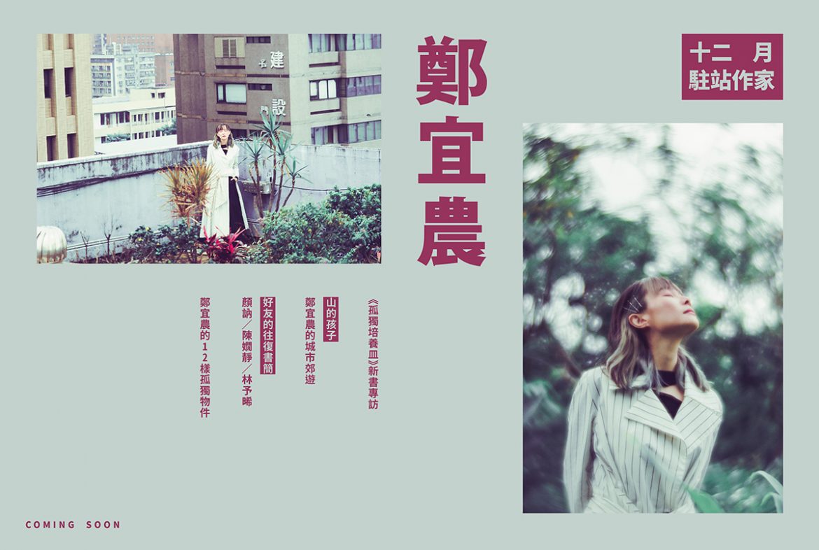 駐站作家鄭宜農2020 【十二月駐站作家】鄭宜農 by 編輯部 2020-12-10 written by 編輯部 2020-12-10 設計|YJ 2.5K 「我好緊張喔!」宜農說。我們也好緊張。 帶著宜農在停車場拍攝、然後過馬路、散步到大安森林公園。拿出偷偷準備的棒球手套,我們一起在草皮上傳接球,然後踩著公園裡會噴水的奇怪腳踏車。讓我們看著這支充滿彩蛋的前導,12月,準備好走入宜農一個又一個的,孤獨培養皿。 玻片裡的預言專訪《孤獨培養皿》作者鄭宜農全文閱讀山的孩子鄭宜農的城市郊遊全文閱讀12樣孤獨物件全文閱讀好友的往復書簡顏訥/陳嫻靜/林予晞全文閱讀 鄭宜農孤獨培養皿 0 comments previous post 【當月精選】之間的風景,與(應有的)潛行—青壯世代台灣小說家創作觀察 next post 【當月精選】天鵝般的小説怪物:邱常婷 You may also like 【當月精選】文字... 2021-07-09 WFH平安通訊|... 2021-06-23 【十二月駐站作家... 2020-12-24 【十二月駐站作家... 2020-12-21 【十二月駐站作家... 2020-12-15 【十二月駐站作家... 2020-12-14 【手寫日記|九月... 2018-09-01 發表意見取消回覆 這個網站採用 Akismet 服務減少垃圾留言。進一步了解 Akismet 如何處理網站訪客的留言資料。