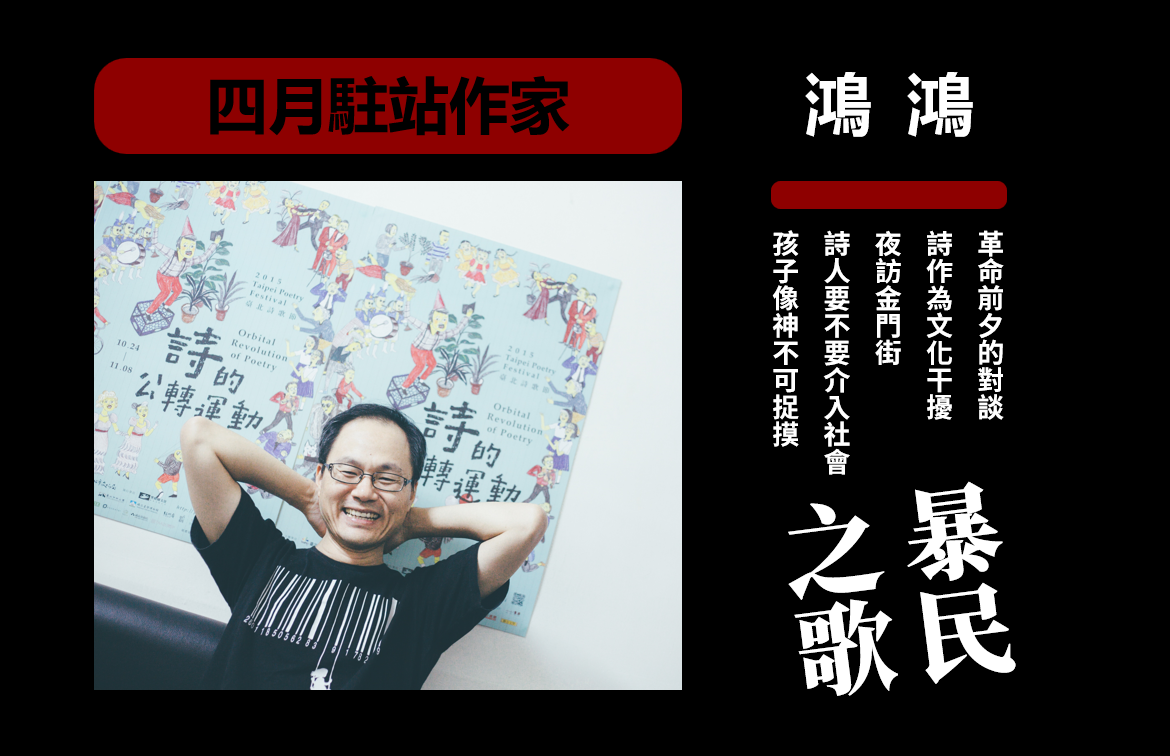在這些時日裡,兒子樂天的誕生也為他生命帶來不同變化。這個月鴻鴻帶我們夜訪金門街,並發表他最新詩作,一起實踐「文化干擾」,抵抗這個被跨國資本壟斷的社會。