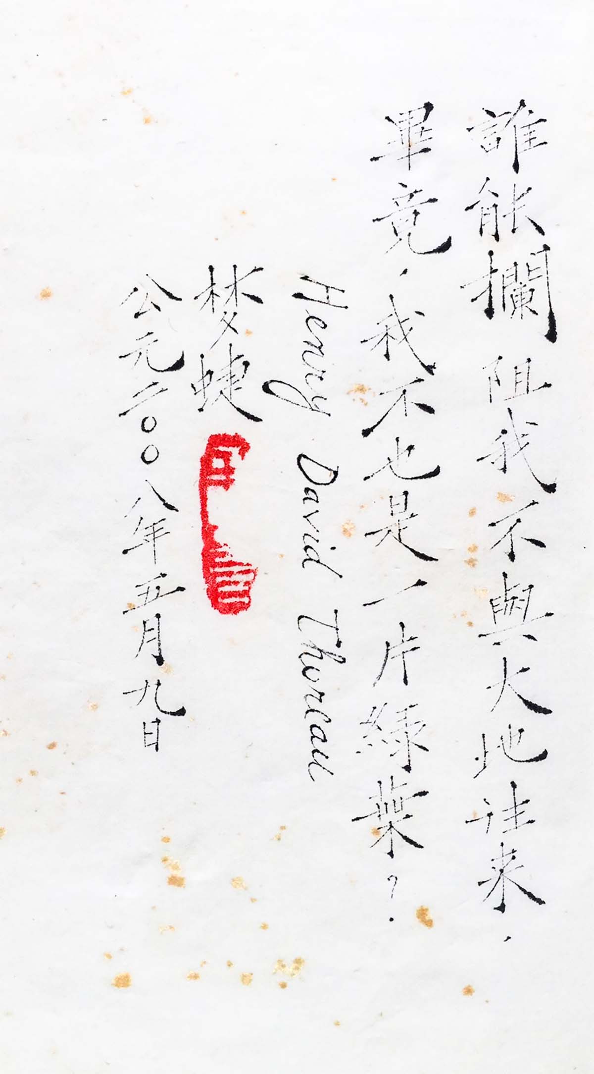「雪忍」—想到孟子的貧賤不能移,一個人沒有財富,這樣的人很容易起貪念。所以我希望自已能定,守得住,像雪一樣,又雪白,又冷靜,知恥不受誘惑。這很不容易做得到,但做一分算一分。