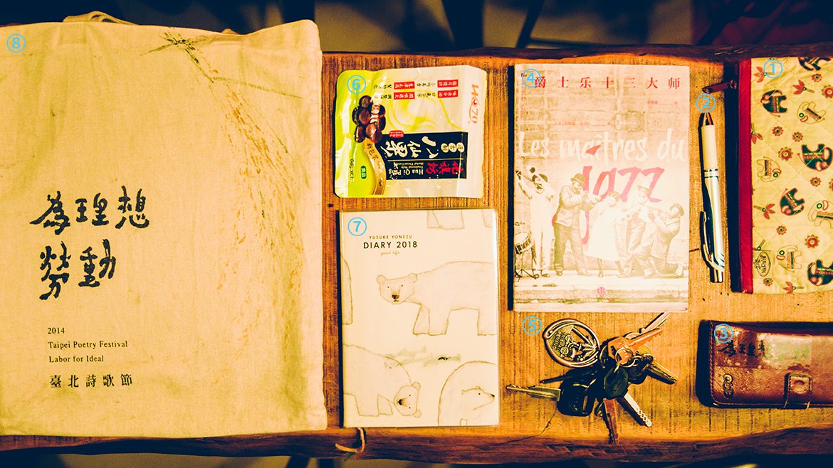 ①隨身包 ②原子筆 ③手機,同時也是名片夾 ④《爵士樂十三大師》 ⑤檳城鑰匙圈 ⑥講課需要的八仙果 ⑦日記筆記本,挑選隔年的筆記本是每年最重要的事。 ⑧2014年台北詩歌節帆布袋,何景窗題字,瞇拓繪。
